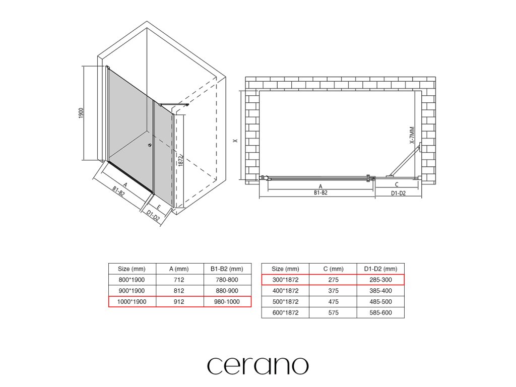Ezen a sorozaton belül széles méretválasztékot kínálunk, hogy kielégítsük ügyfeleink különböző igényeit. Minden CERANO zuhanykabin, ajtó és paraván teljesen kompatibilis az azonos méretű CERANO zuhanytálcákkal , biztosítva a zökkenőmentes telepítést és a tökéletes összehangolást.