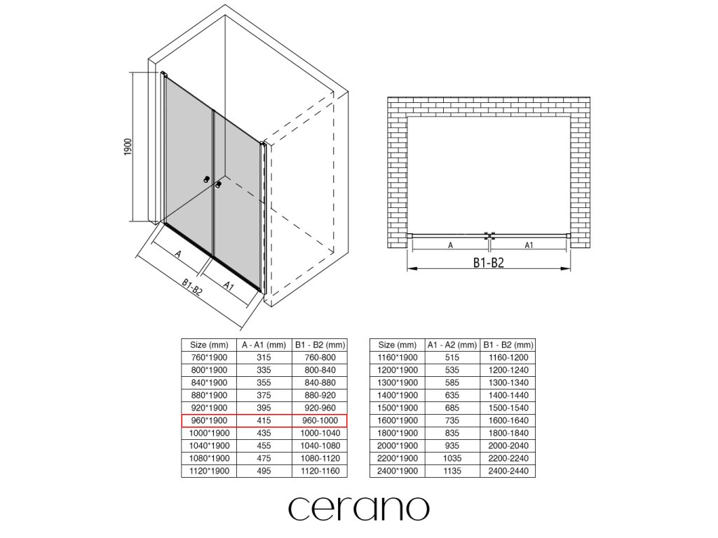 Ezen a sorozaton belül széles méretválasztékot kínálunk, hogy kielégítsük ügyfeleink különböző igényeit. Minden CERANO zuhanykabin, ajtó és paraván teljesen kompatibilis az azonos méretű CERANO zuhanytálcákkal , biztosítva a zökkenőmentes telepítést és a tökéletes összehangolást.