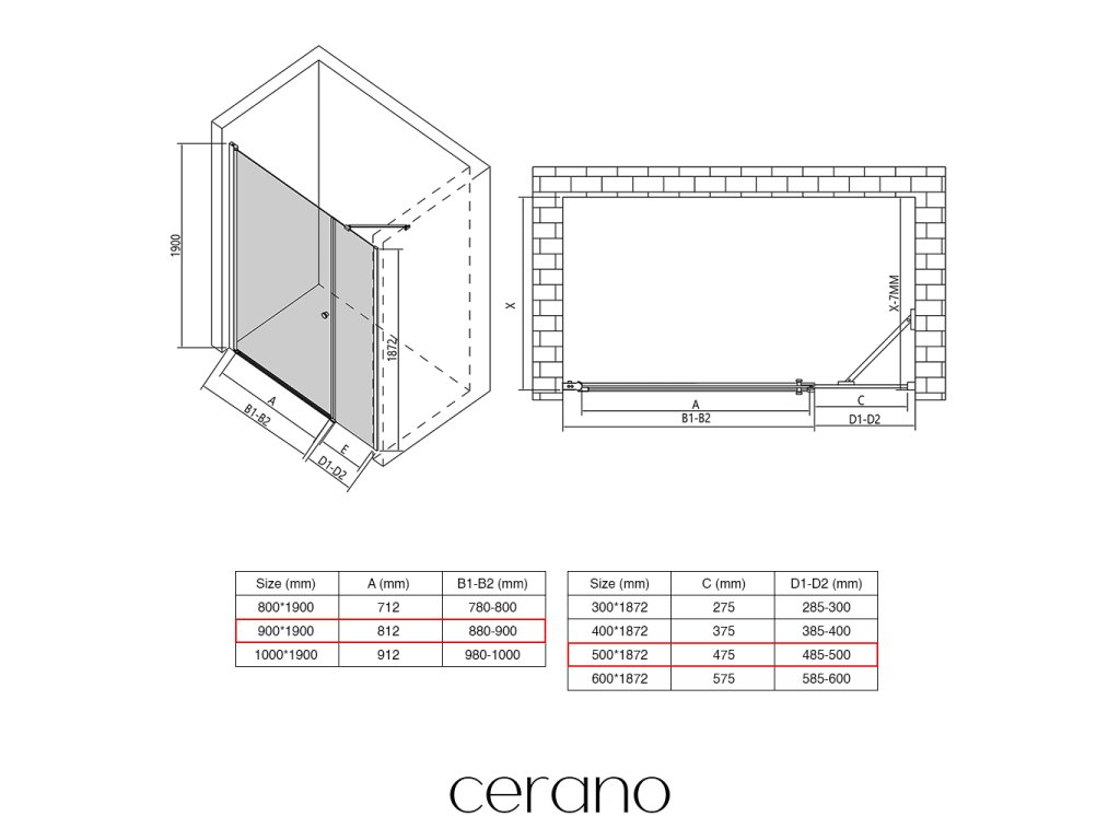 Ezen a sorozaton belül széles méretválasztékot kínálunk, hogy kielégítsük ügyfeleink különböző igényeit. Minden CERANO zuhanykabin, ajtó és paraván teljesen kompatibilis az azonos méretű CERANO zuhanytálcákkal , biztosítva a zökkenőmentes telepítést és a tökéletes összehangolást.