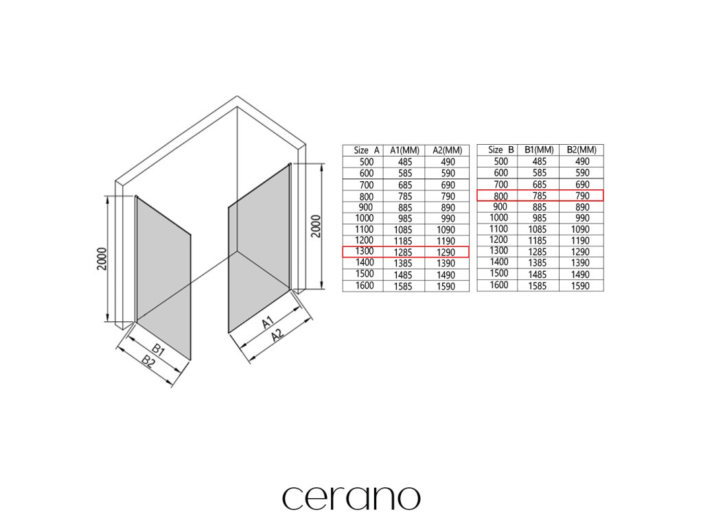 Ezen a sorozaton belül széles méretválasztékot kínálunk, hogy kielégítsük ügyfeleink különböző igényeit. Minden Cerano zuhanykabin, ajtó és paraván teljesen kompatibilis az azonos méretű Cerano zuhanytálcákkal , biztosítva a zökkenőmentes beszerelést és a tökéletes illeszkedést. Ezenkívül a zuhanykabin rugalmasan beszerelhető – akár a hozzá illő zuhanytálcára , akár közvetlenül a padlóra , az Ön preferenciáitól és a fürdőszobai lehetőségektől függően.