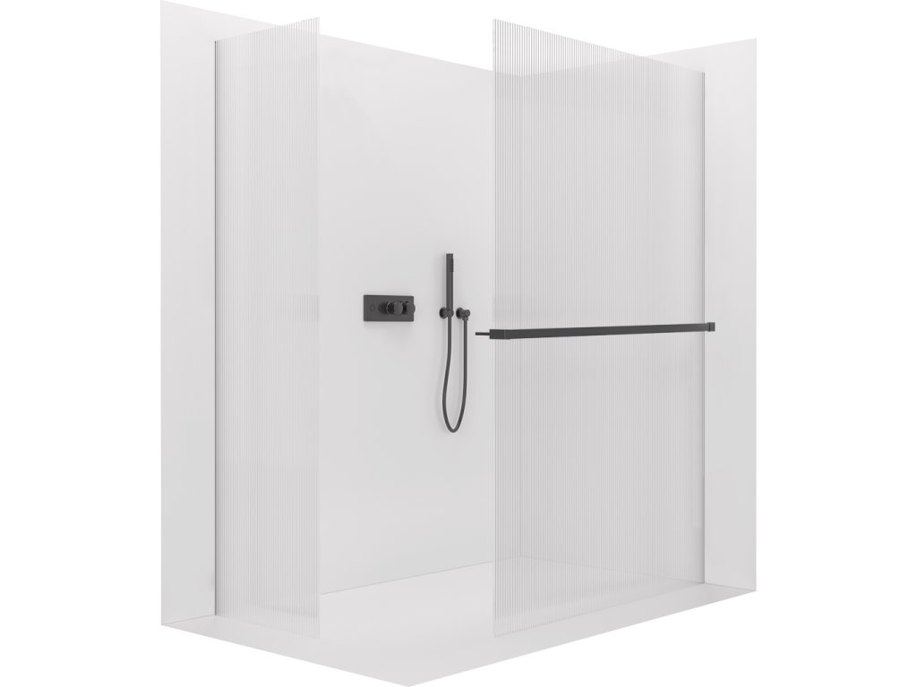 CERANO - Walk-in Crystal TL/P zuhanyfal - 8 mm - merevítő nélküli rendszer + törölközőtartó polc/tartó - matt fekete, rovátkolt üveg - 130x80x200 cm