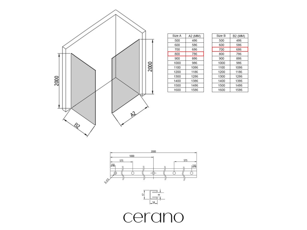 Ezen a sorozaton belül széles méretválasztékot kínálunk, hogy kielégítsük ügyfeleink különböző igényeit. Minden Cerano zuhanykabin, ajtó és paraván teljesen kompatibilis az azonos méretű Cerano zuhanytálcákkal , biztosítva a zökkenőmentes beszerelést és a tökéletes illeszkedést. Ezenkívül a zuhanykabin rugalmasan beszerelhető – akár a hozzá illő zuhanytálcára , akár közvetlenül a padlóra , az Ön preferenciáitól és a fürdőszobai lehetőségektől függően.