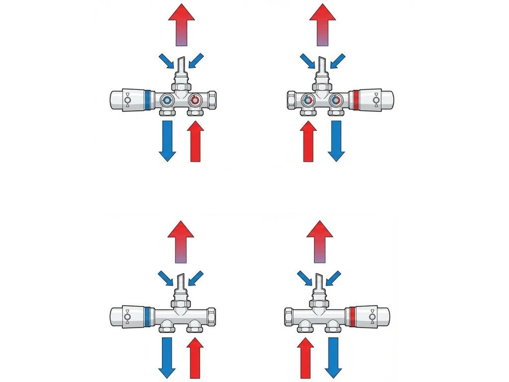 - ferde és egyenes kialakítás jobb és bal oldalra (a hőfej mindig a visszatérő ágra van felszerelve)