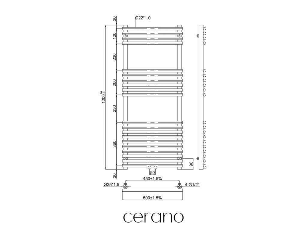 A standard radiátorcsatlakozás 1/2"-os, ami biztosítja a kompatibilitást a Cerano szelepekkel és csatlakozókészletekkel, valamint más gyártók szelepeivel és csatlakozókészleteivel. A biztonságos és hatékony működés érdekében győződjön meg arról, hogy minden alkatrész illeszkedik ehhez az átmérőhöz.