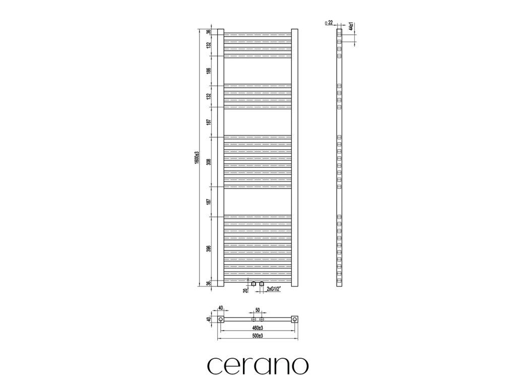 CERANO - Franko fürdőszobai radiátor - központi csatlakozás 50mm/oldalsó - 514W - matt fekete - 1600x500 mm
