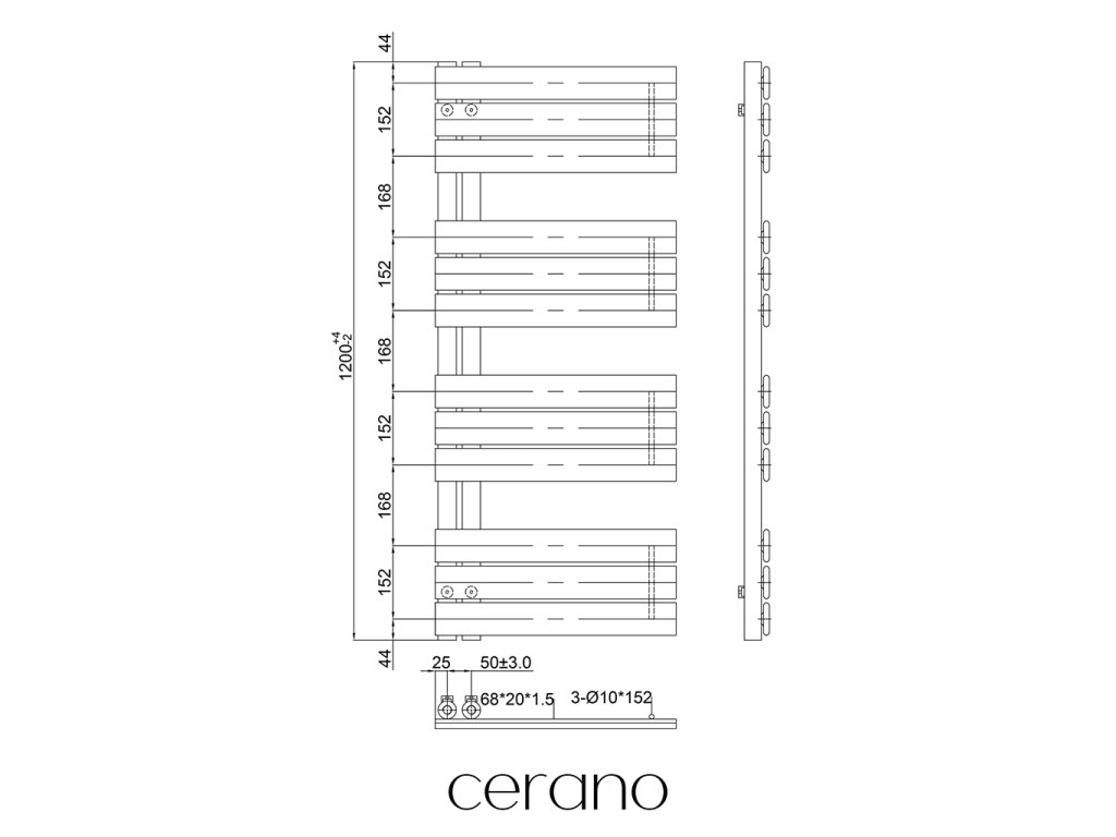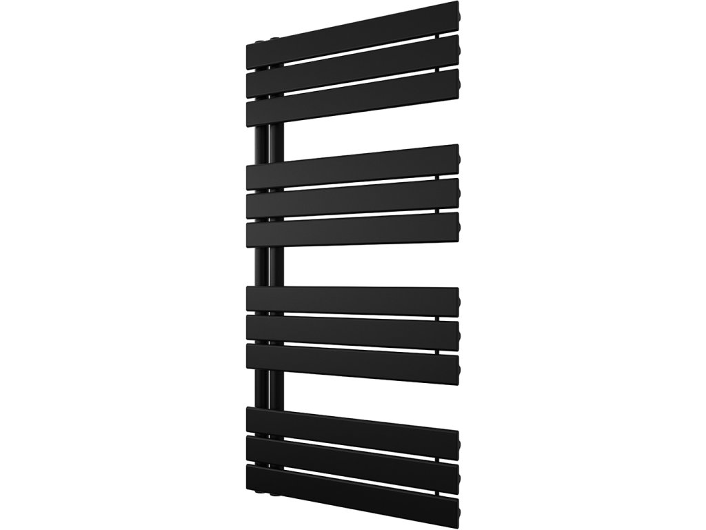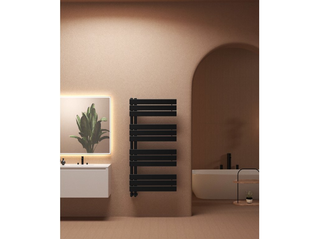 CERANO - Theo fürdőszobai radiátor - B/J - aszimmetrikus csatlakozás 50mm - 650W - matt fekete - 1200x500 mm