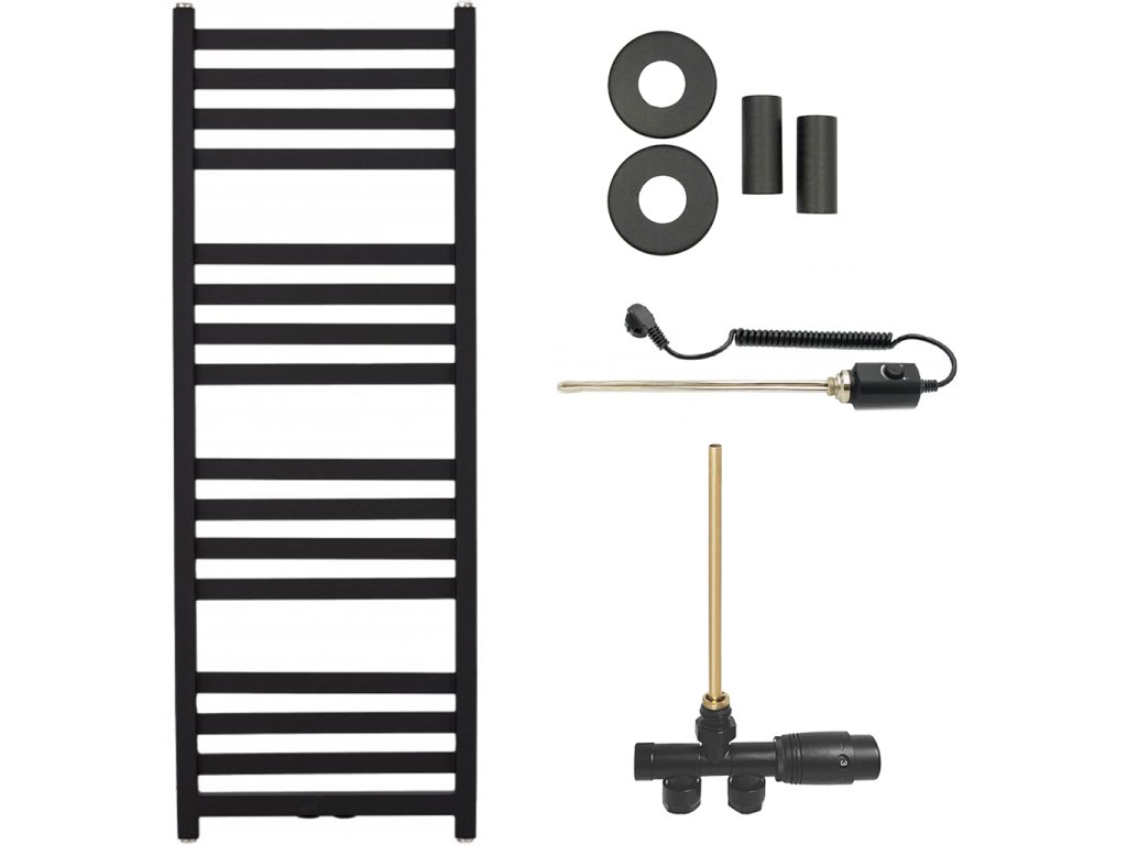 CERANO - Fulgidus fürdőszobai radiátor szett - kombinált fűtéssel, termosztáttal - oldalsó egypontos csatlakozással - 616W - matt fekete - 1190x430 mm