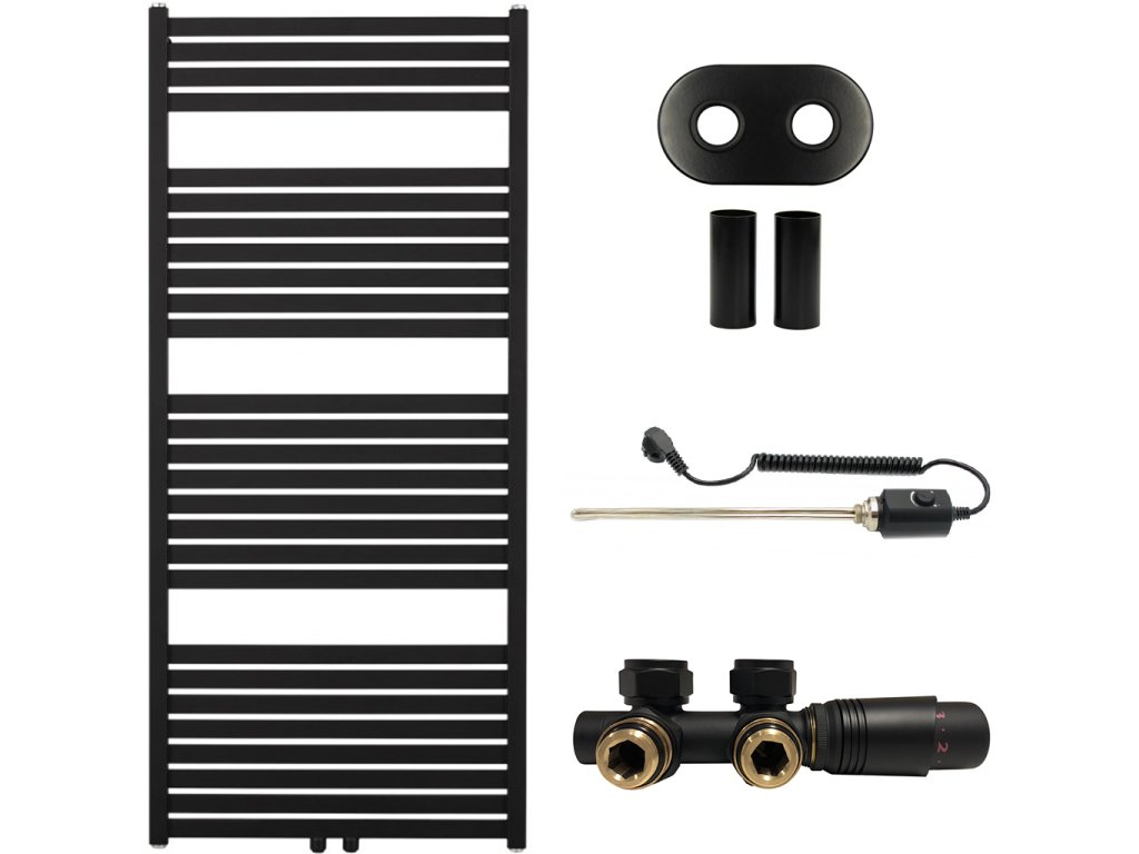 CERANO - Vincenzo fürdőszobai radiátor szett - kombinált fűtéssel, termosztáttal - központi csatlakozással 50 mm - 600W - matt fekete - 1330x600 mm
