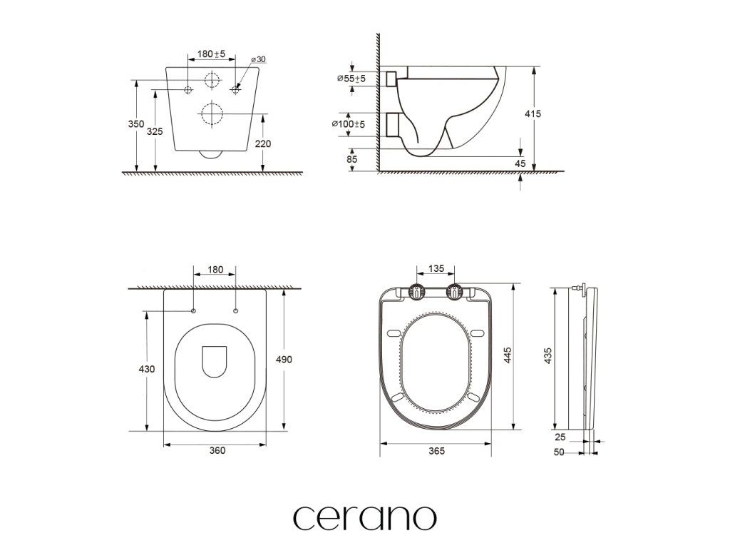 A Cerano fali WC-k könnyen felszerelhetők, és a szabványos rögzítési távolságnak köszönhetően kompatibilisek a Cerano modulokkal, valamint olyan márkák termékeivel, mint a Geberit, Grohe, Alcadrain, Jika, Tece stb.