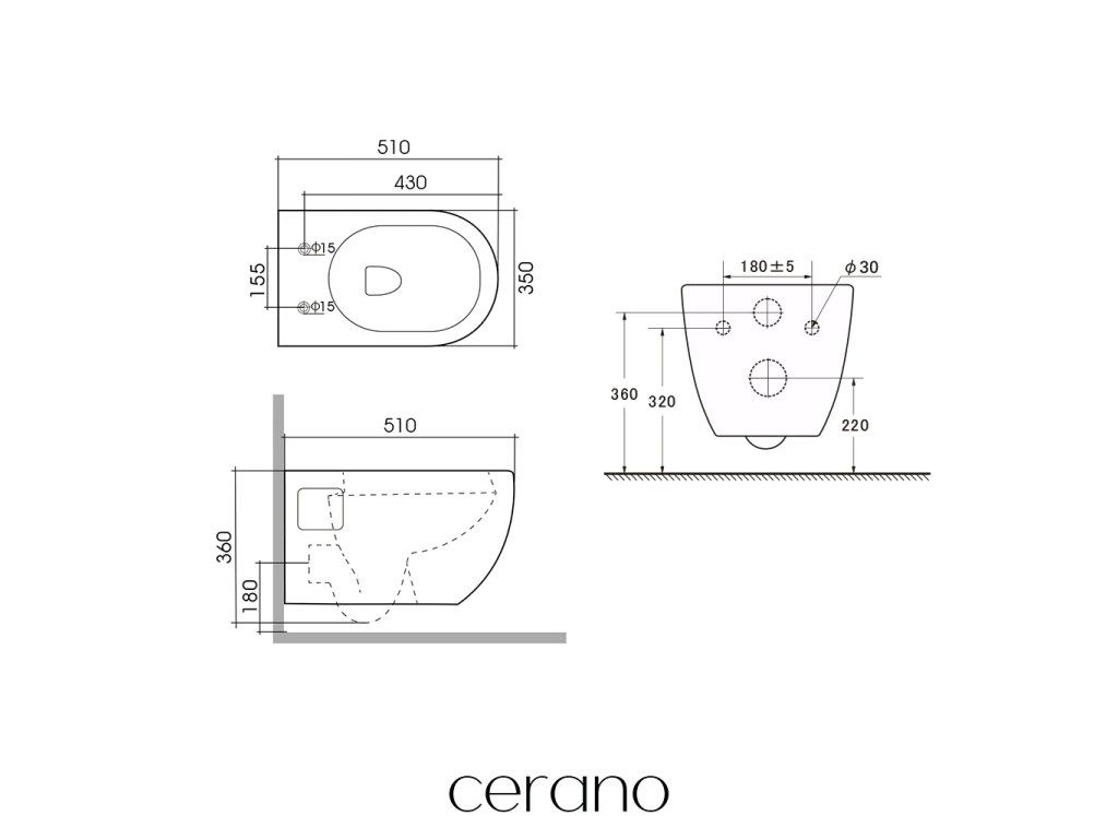 A Cerano fali WC-k könnyen felszerelhetők, és a szabványos rögzítési távolságnak köszönhetően kompatibilisek a Cerano modulokkal, valamint olyan márkák termékeivel, mint a Geberit, Grohe, Alcadrain, Jika, Tece stb.