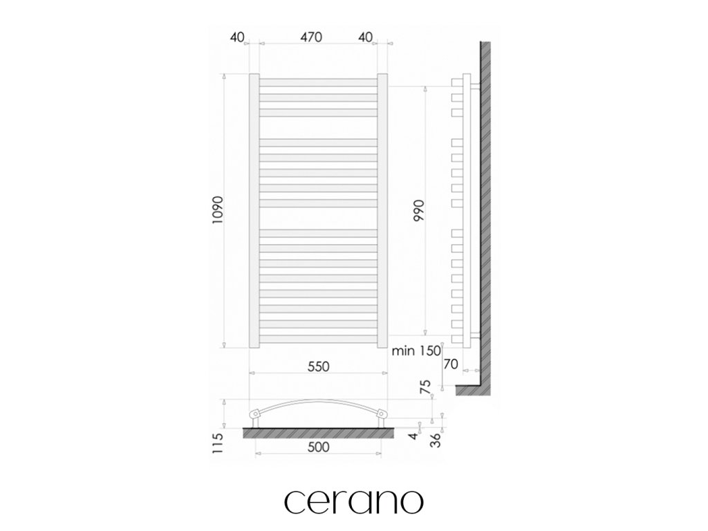 CERANO - Paolo fürdőszobai radiátor szett - központi fűtés - oldalsó csatlakozás - 604W - matt fekete - 1090x550 mm