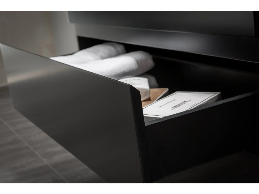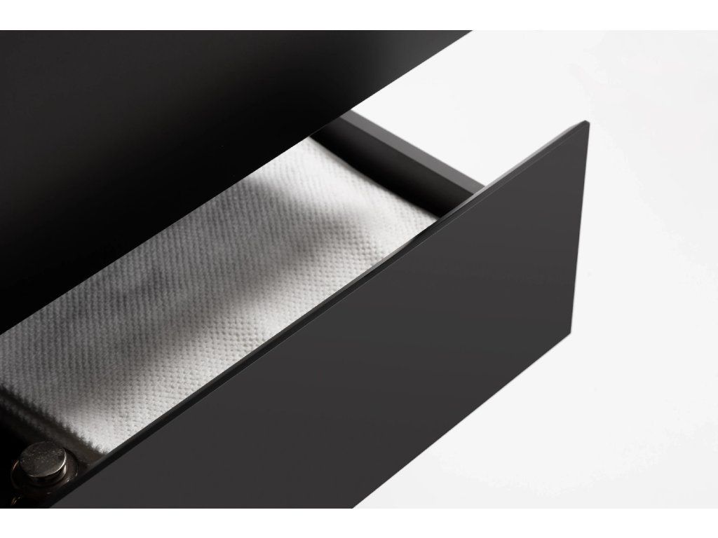A szekrény falra szerelhető, és állítható szerelvényekkel van felszerelve, amelyek a szekrény testén a felső fríz alatt találhatók, lehetővé téve a magasság és a sík beállítását. A fiókban egy rejtett kivágás található a mosdó szifonjának beépítéséhez.