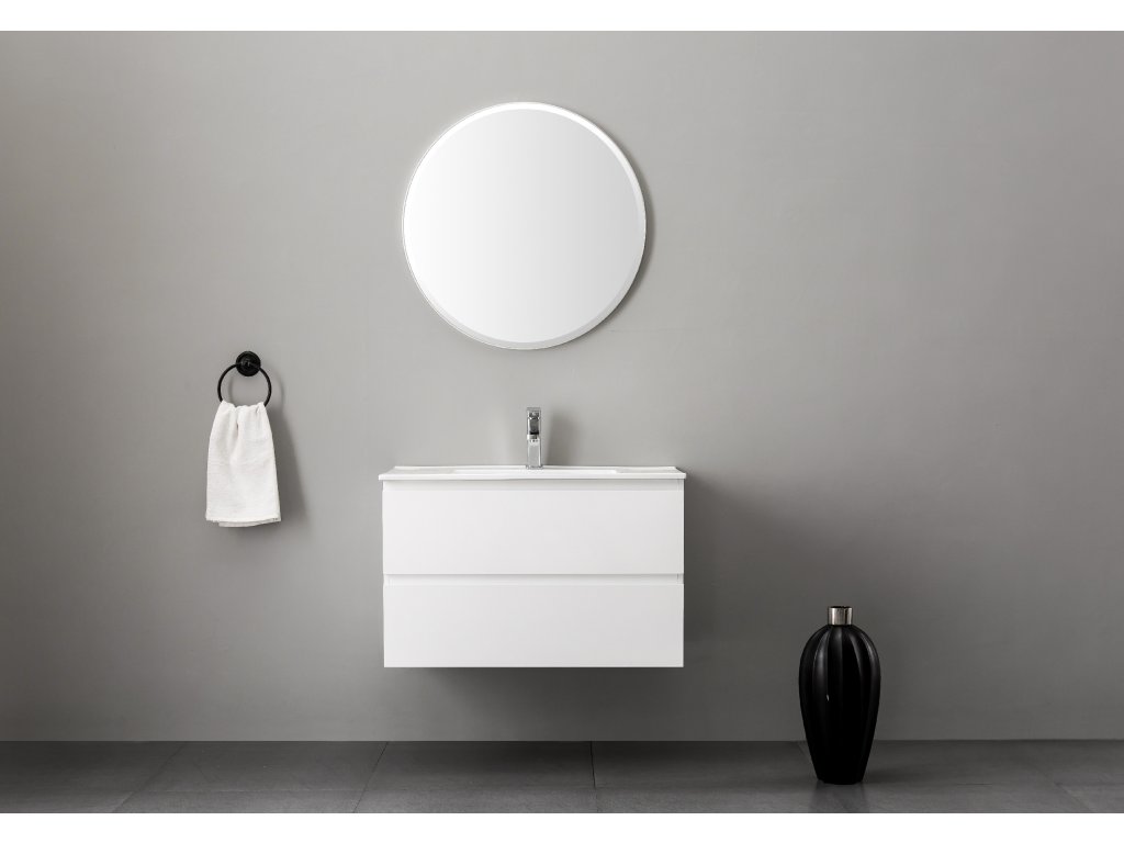 A fürdőszobaszekrények MDF laminátumból (közepes sűrűségű farostlemez) készülnek, préselt melamin fóliával bevonva, amely ellenáll a nedvességnek, a karcolásoknak, az UV-sugárzásnak és a szokásos tisztítószereknek. A felület sima, kemény, homogén és könnyen tisztítható. Az MDF lapok nem vetemednek, mint a tömör fa. Ha a laminátum mechanikai sérülést szenved, maga az MDF mag is nedvessé válhat.