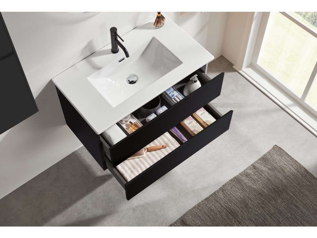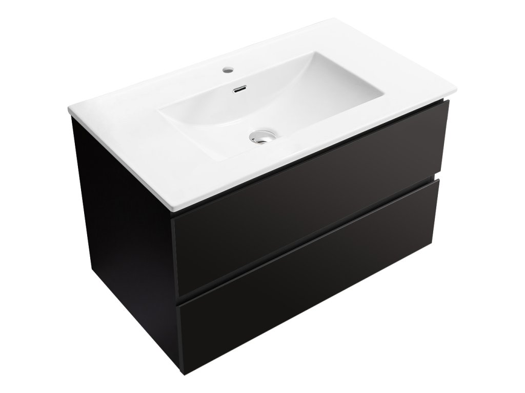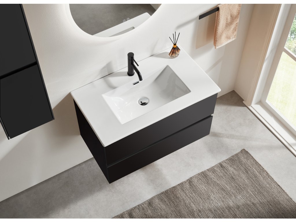 CERANO - Carole fürdőszobaszekrény - matt fekete + Novo kerámia mosdó - fényes fehér - 81x49,5x46,5 cm