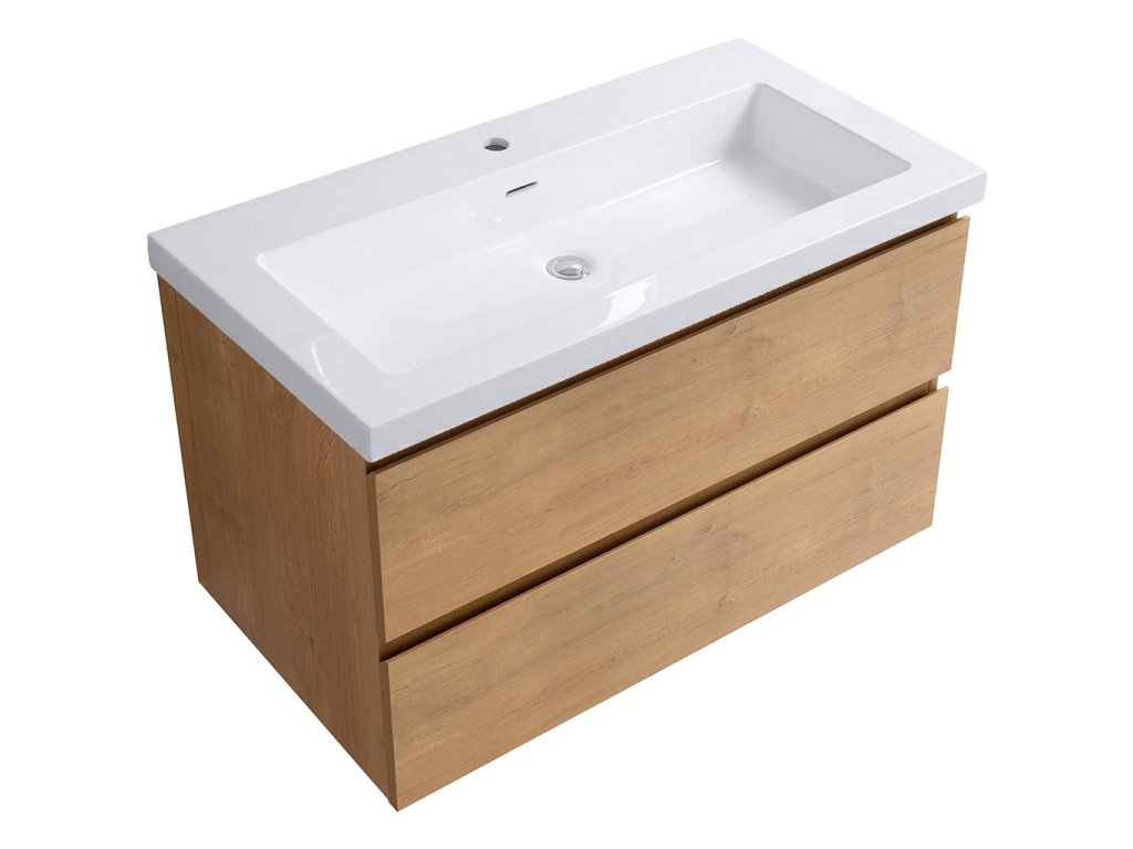 CERANO - Carole fürdőszobaszekrény - mézes tölgyfa + mosdó lit. Ovo márványból - fényes fehér - 81x49,5x46,5 cm