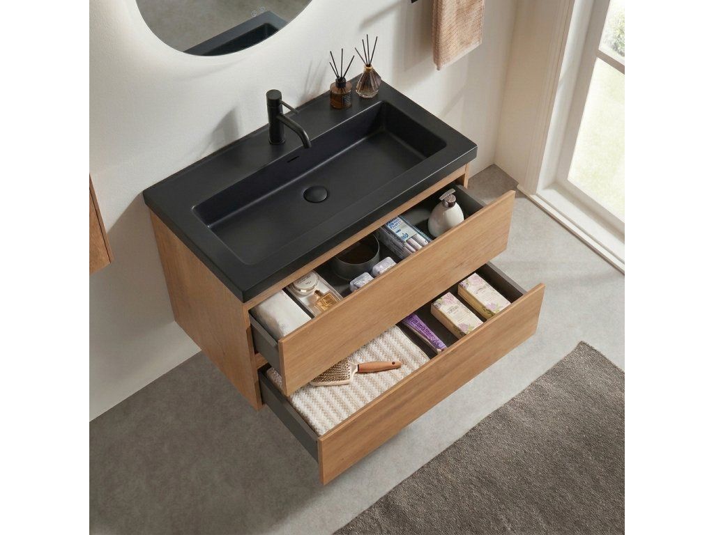 CERANO - Carole fürdőszobaszekrény - mézes tölgyfa + Ovo megvilágított márvány mosdó - matt fekete - 101x49.5x46.5 cm