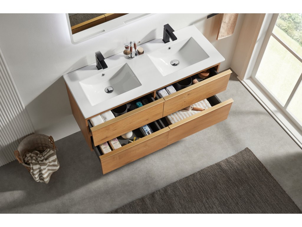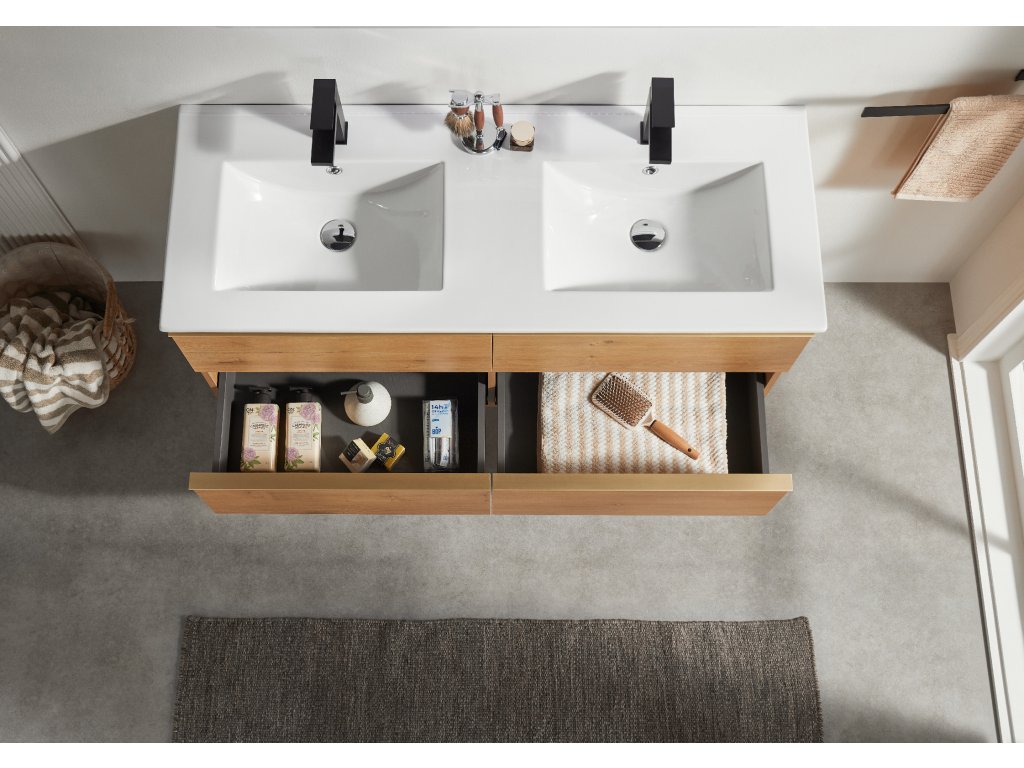 CERANO - Fürdőszobaszekrény mosdó alá Velora fogantyúval + Todo kerámia mosdó - mézes tölgy, arany fogantyú - 119x53x45,2 cm
