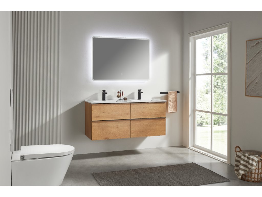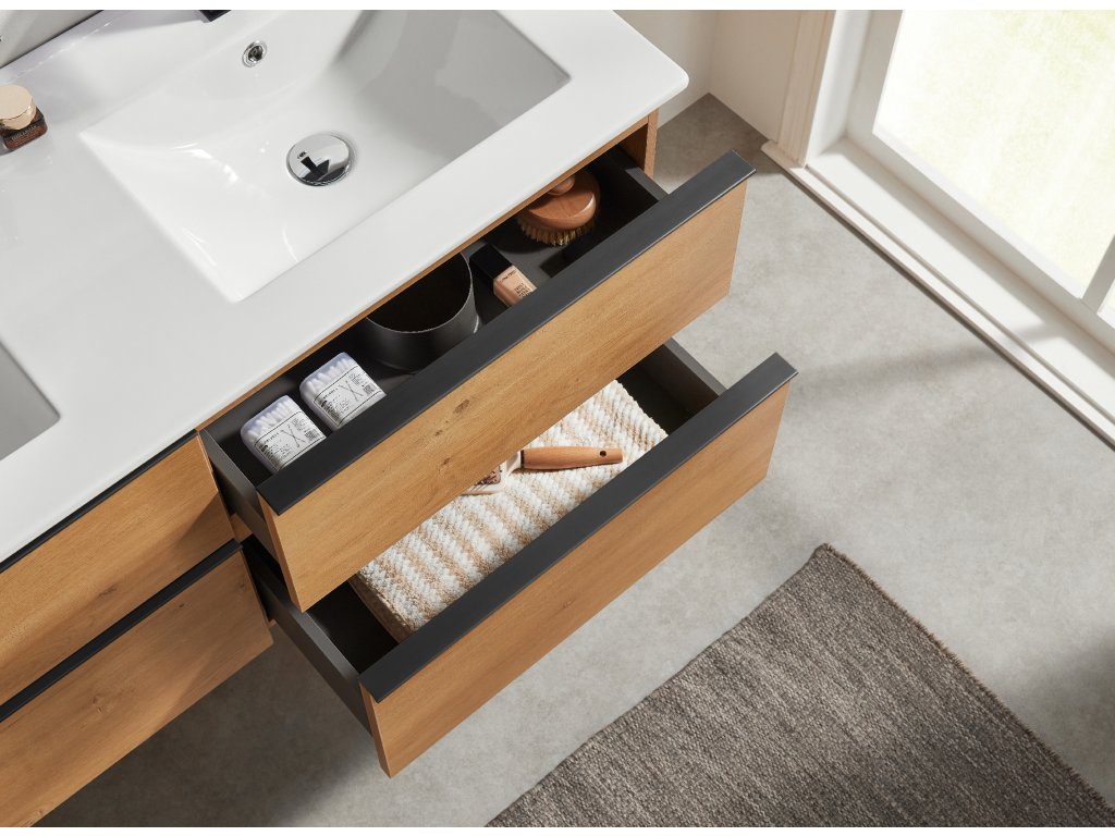 CERANO - Fürdőszobaszekrény mosdó alá Velora fogantyúval + Todo kerámia mosdó - mézes tölgy, fekete fogantyú - 119x53x45,2 cm