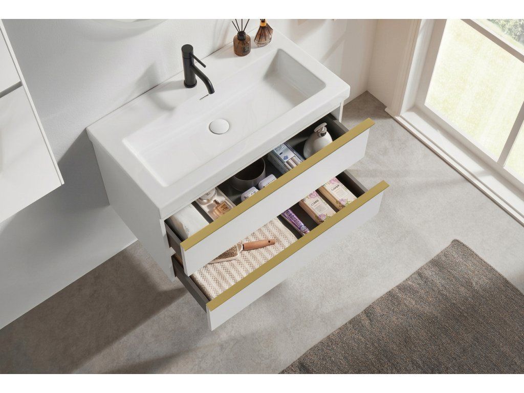 CERANO - Velora fürdőszobaszekrény - fényes fehér - arany fogantyú + lit. Ovo márványból készült mosdó - matt fehér - 69x53x46 cm