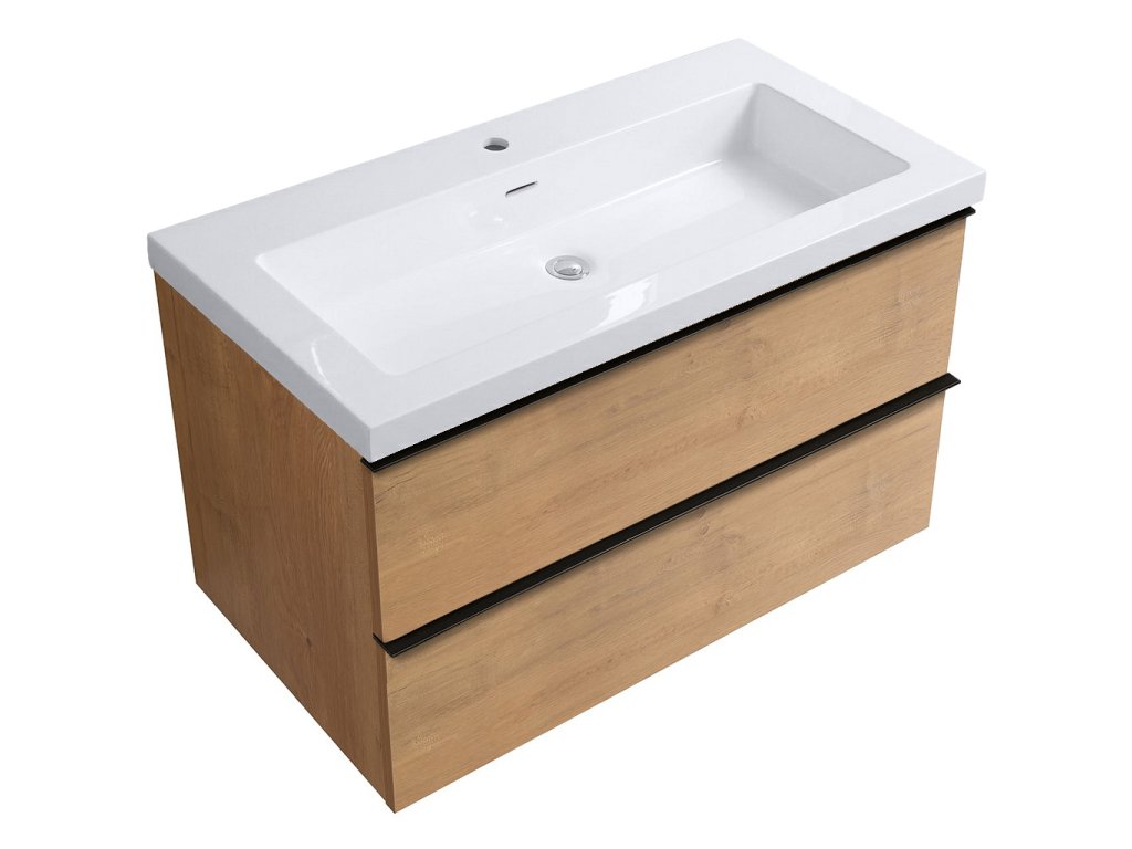 CERANO - Velora fürdőszobaszekrény - fényes fehér - fekete fogantyú + márvány mosdó - mézes tölgyfa - 99x53x46 cm