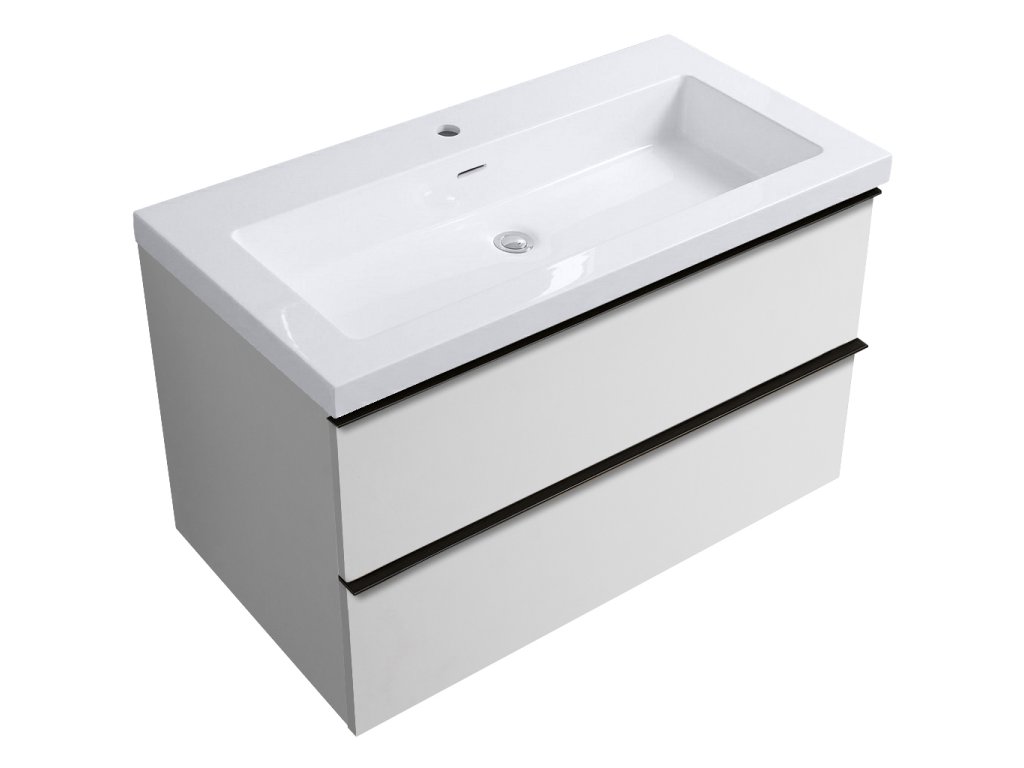 CERANO - Velora fürdőszobaszekrény - fényes fehér - fekete fogantyú + világító márvány mosdó - matt fehér - 79x53x46 cm
