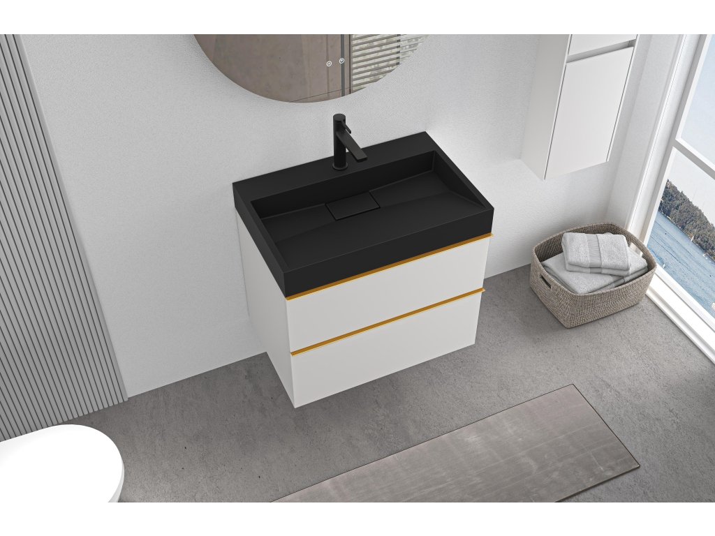 CERANO - Velora fürdőszobaszekrény - matt fehér - arany fogantyú + csaplyukkal ellátott mosdó öntött márványból Vita - fekete - 70x53x46 cm