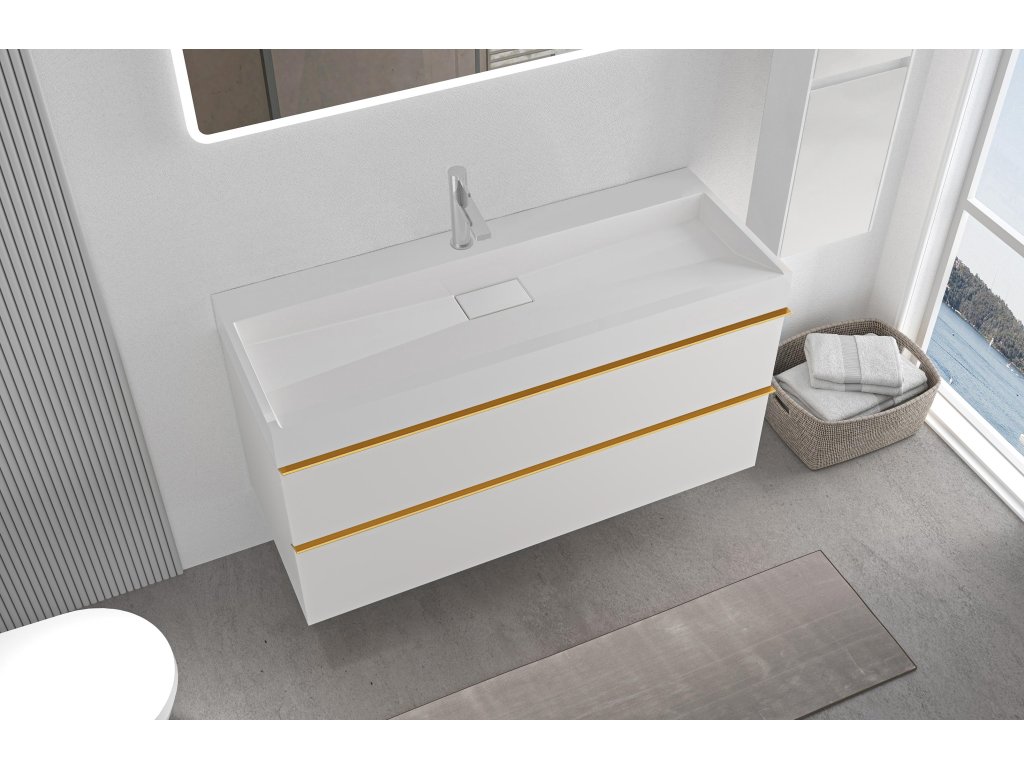 CERANO - Velora fürdőszobaszekrény - matt fehér - arany fogantyú + csaplyukkal ellátott mosdó öntött márványból Vita - fényes fehér - 100x53x46 cm