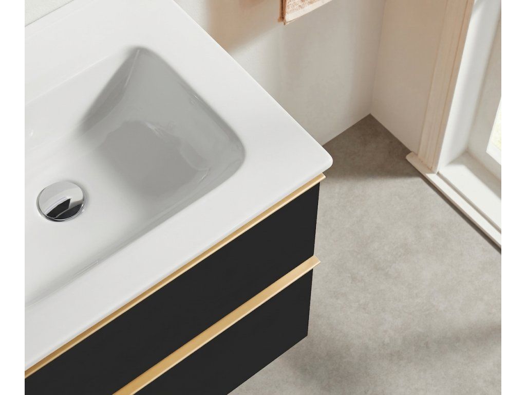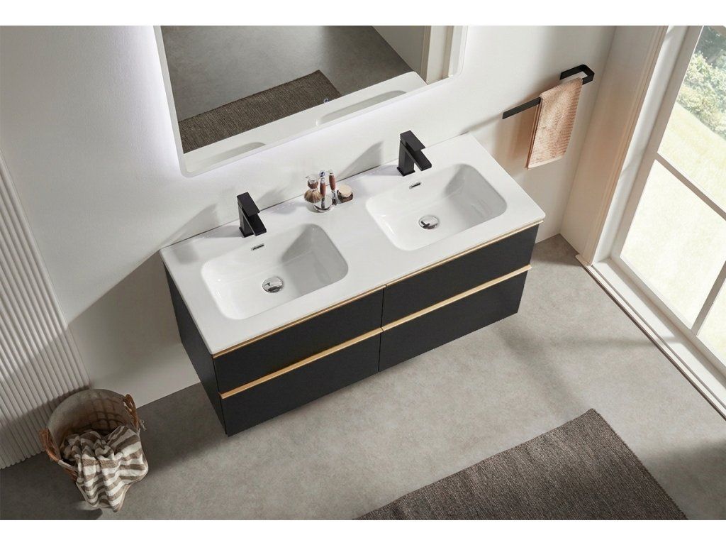 CERANO - Velora fürdőszobaszekrény - matt fekete, arany fogantyú + Novo kerámia mosdó - fényes fehér - 121x54,5x46,5 cm
