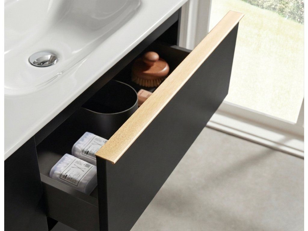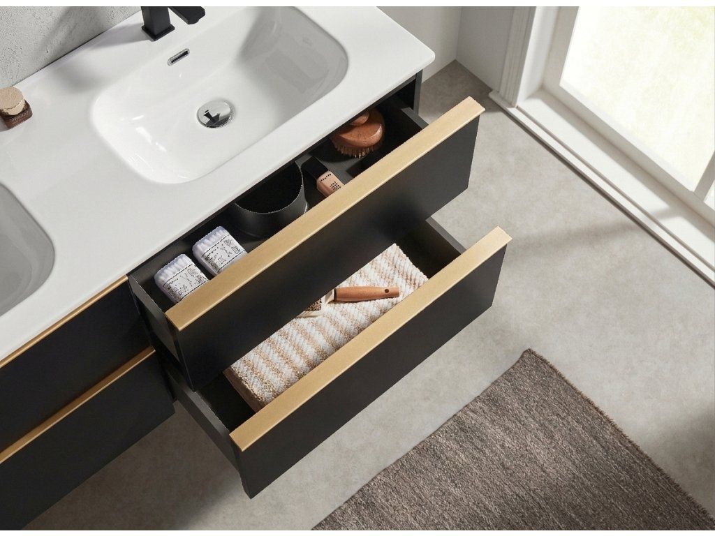 A szekrény falra szerelhető, és állítható szerelvényekkel van felszerelve, amelyek a szekrény testén a felső fríz alatt találhatók, lehetővé téve a magasság és a sík beállítását. A fiókban egy rejtett kivágás található a mosdó szifonjának beépítéséhez.