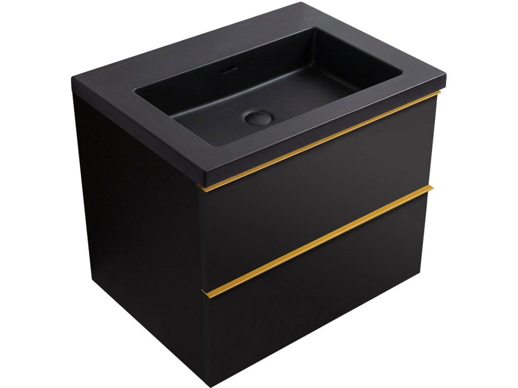 CERANO - Velora fürdőszobaszekrény - matt fekete, arany fogantyú + Ovo márvány mosdó - matt fekete - 70,5x58x46,5 cm