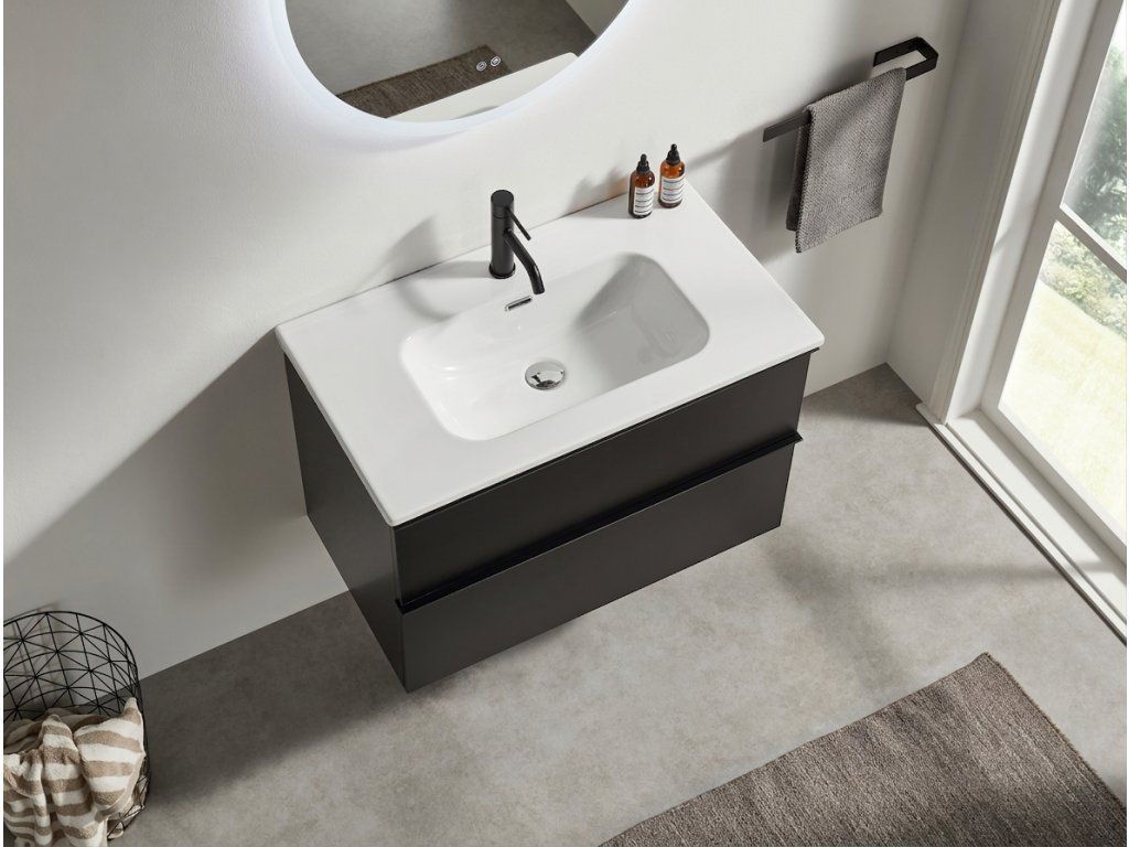 CERANO - Velora fürdőszobaszekrény - matt fekete, fekete fogantyú + Novo kerámia mosdó - fényes fehér - 71x54,5x46,5 cm