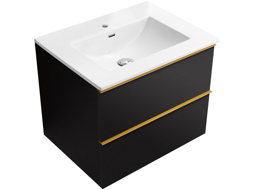 CERANO - Velora fürdőszobaszekrény - matt fekete - arany fogantyú + Novo kerámia mosdó - fényes fehér - 69x53x46 cm
