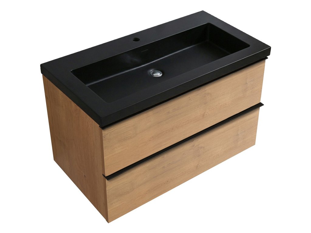 CERANO - Velora fürdőszobaszekrény - matt fekete - fekete fogantyú + öntött márvány mosdó - mézes tölgy - 99x53x46 cm