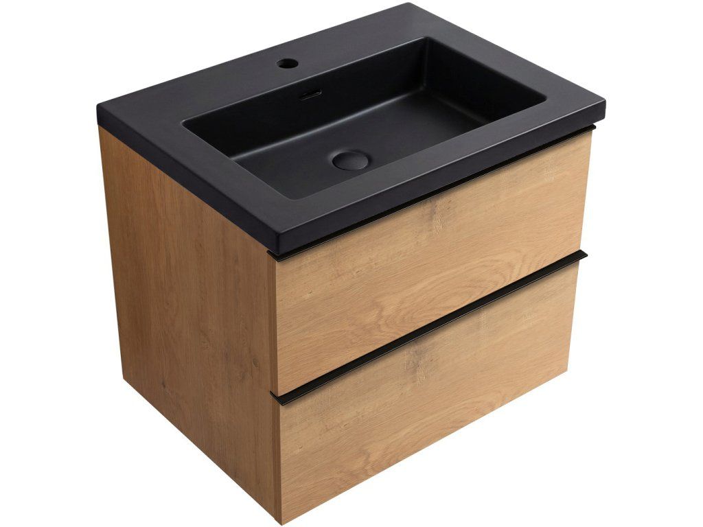 CERANO - Velora fürdőszobaszekrény - matt fekete - fekete fogantyú + Ovo öntött márvány mosdó - mézes tölgyfa - 69x53x46 cm