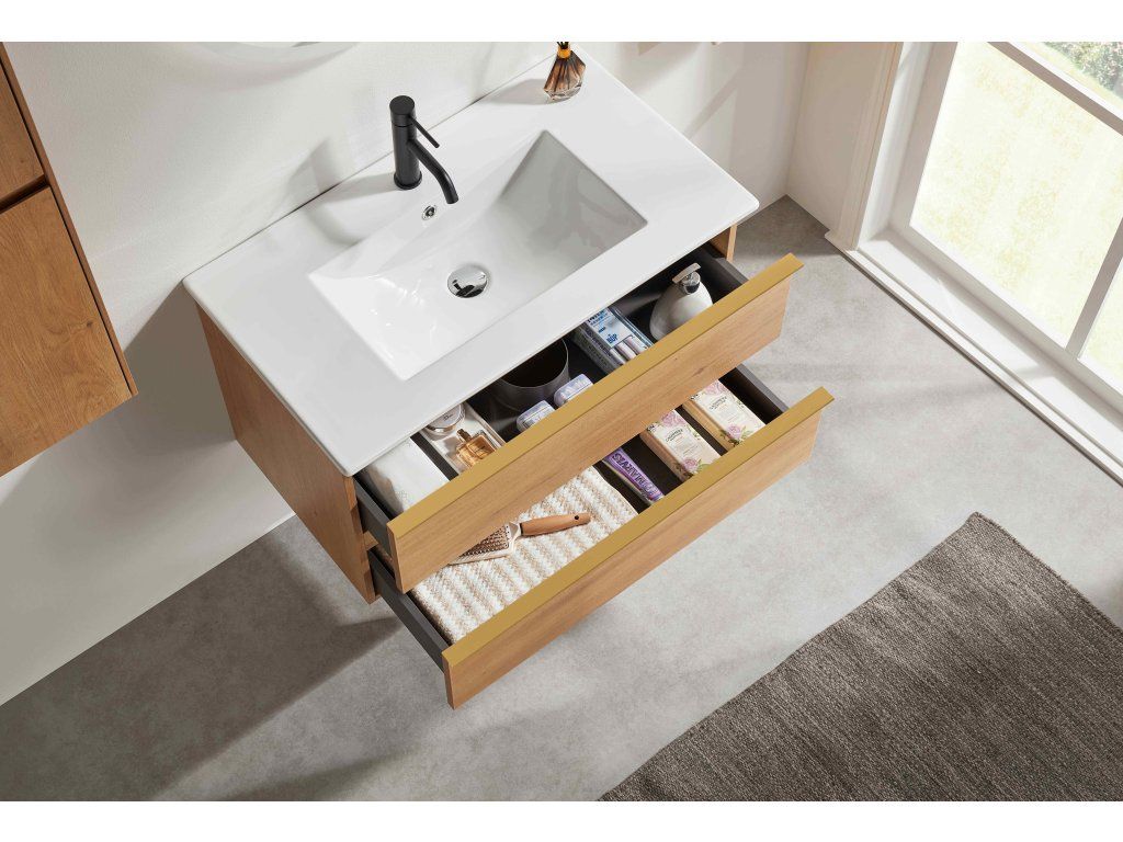 CERANO - Velora fürdőszobaszekrény - mézes tölgyfa, arany fogantyú + Todo kerámia mosdó - 101x55x46,5 cm