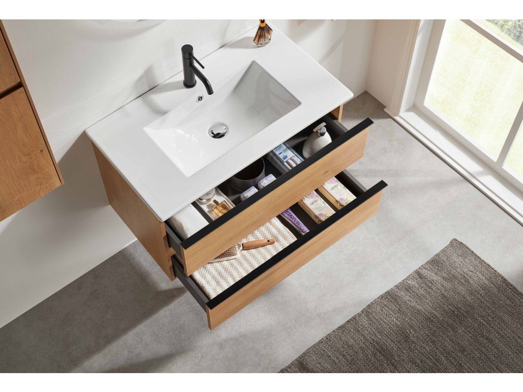 CERANO - Velora fürdőszobaszekrény - mézes tölgyfa, fekete fogantyú + Todo kerámia mosogató - 61x55x46,5 cm