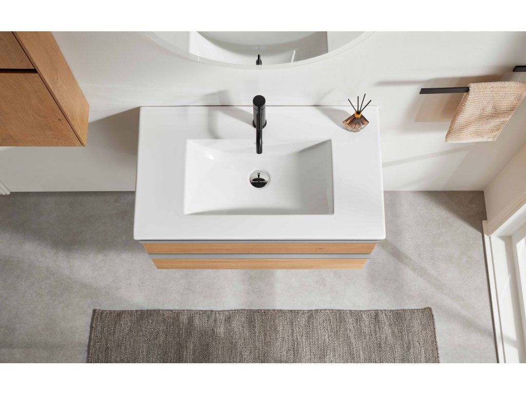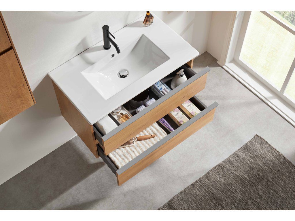 CERANO - Velora fürdőszobaszekrény - mézes tölgyfa, króm fogantyú + Todo kerámia mosogató - 81x55x46,5 cm