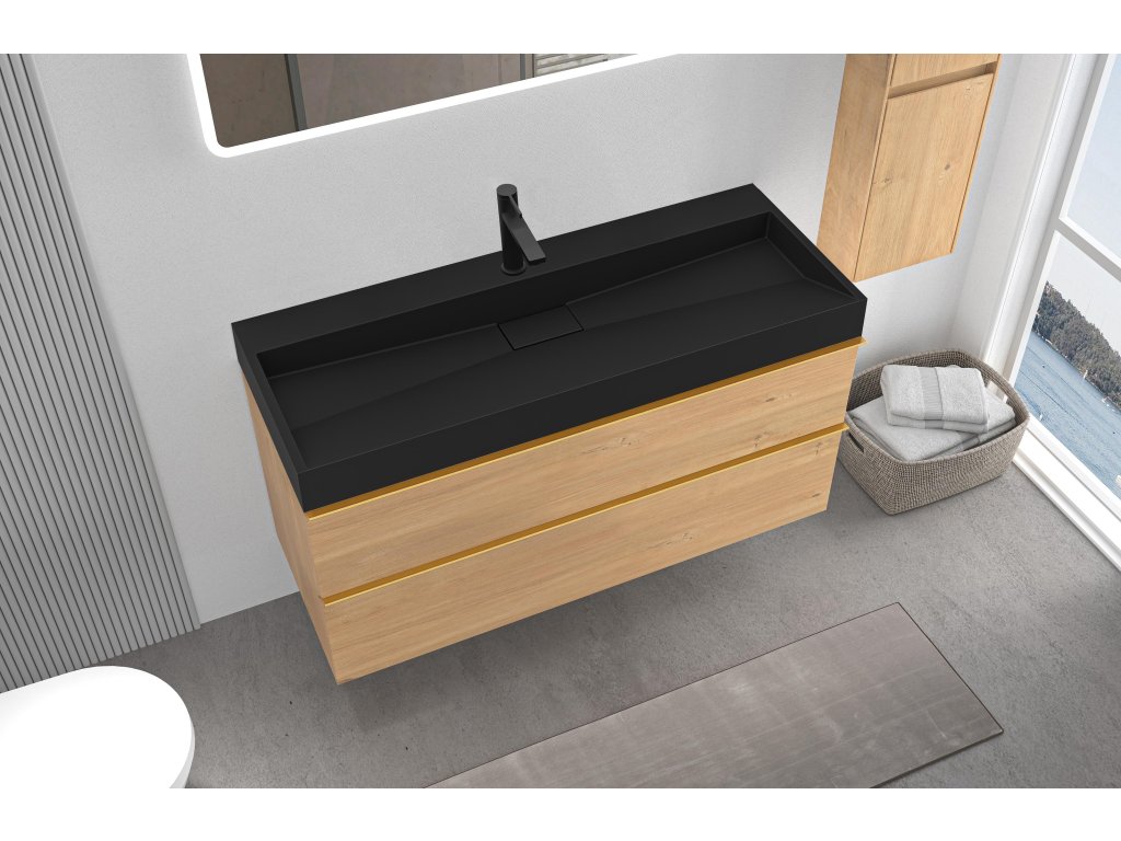 CERANO - Velora fürdőszobaszekrény - mézes tölgyfa - arany fogantyú + Vita öntött márványból készült mosdó csaplyukkal - fekete - 100x53x46 cm