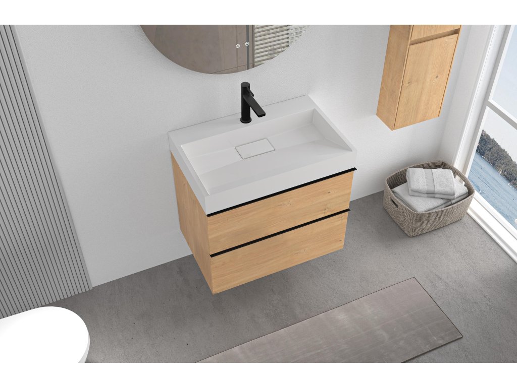 CERANO - Velora fürdőszobaszekrény - mézes tölgyfa - fekete fogantyú + Vita öntött márványból készült mosdó csaplyukkal - fényes fehér - 70x53x46 cm
