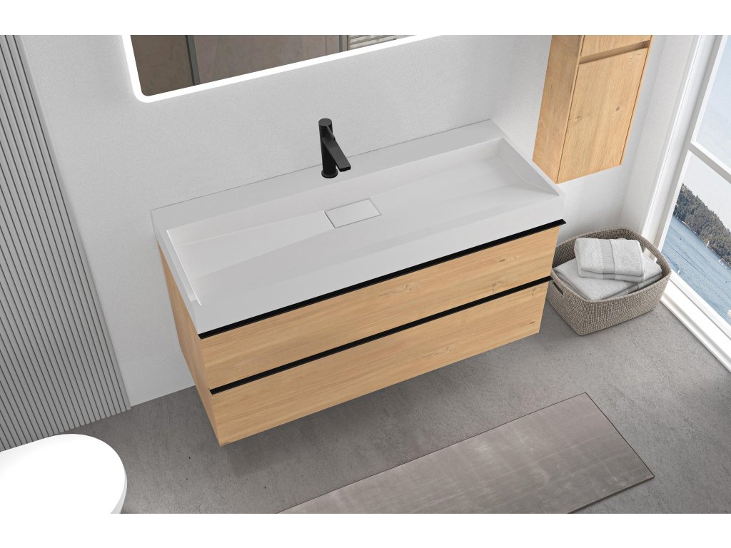 CERANO - Velora fürdőszobaszekrény - mézes tölgyfa - fekete fogantyú + Vita öntött márványból készült mosdó csaplyukkal - matt fehér - 100x53x46 cm