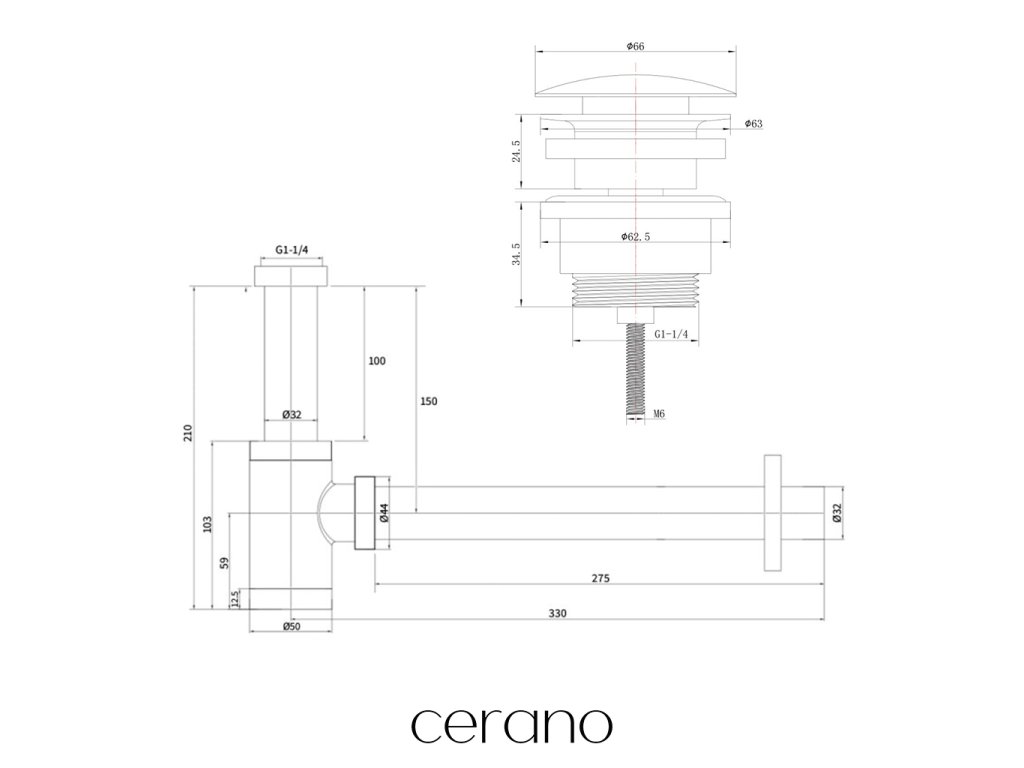 CERANO - Mosdószifon - sárgaréz - DN32 mm - klikk-klakk lefolyóval és túlfolyóval - fekete