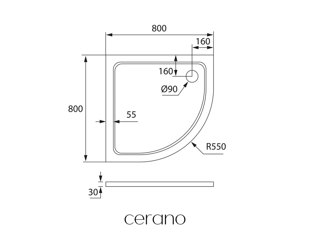 CERANO - Öntött márvány zuhanytálca, negyedkör alakú Piato - fényes fehér - 80x80x3 cm