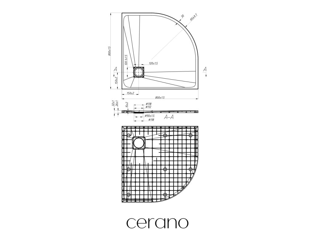 CERANO - Quarto negyedkör alakú zuhanytálca - SMC/ásványi kompozit - strukturált fehér matt - 80x80x3 cm