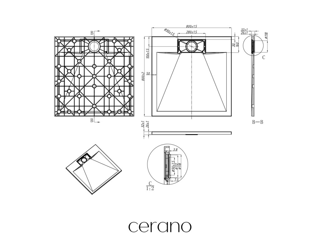 CERANO - Négyzet alakú zuhanytálca Enzo - SMC/ásványi kompozit - strukturált fehér matt - 80x80x3 cm