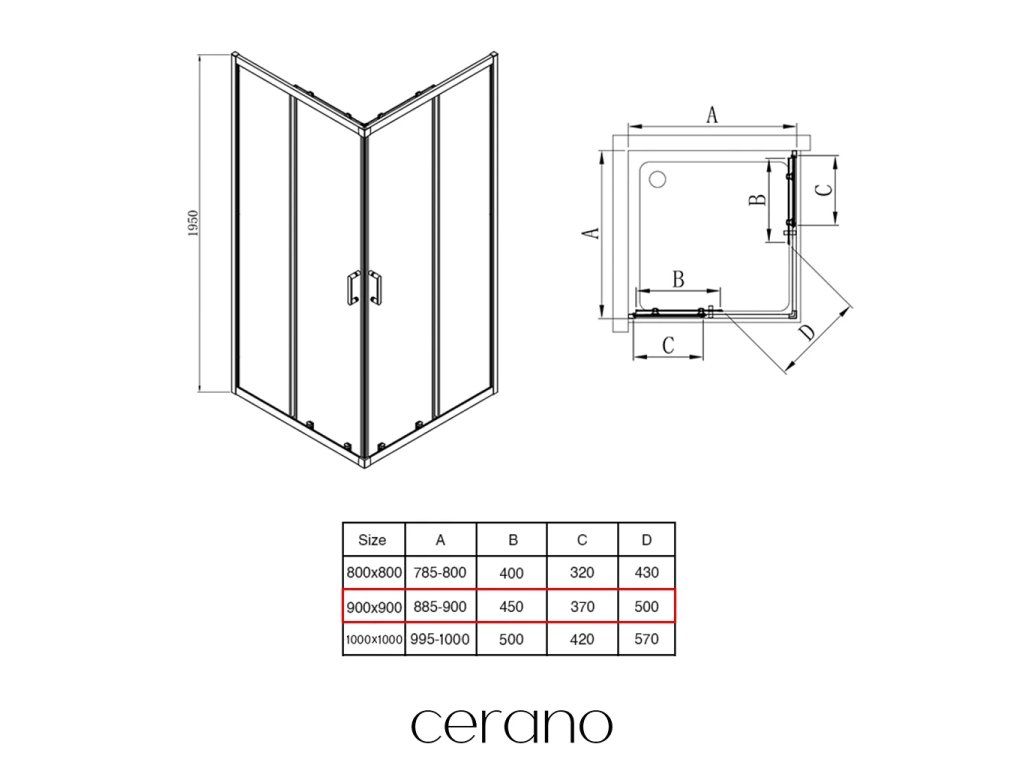 CERANO - Zuhanykabin Fabrizio B/J - 5 mm - matt fekete, átlátszó üveg - 90x90x195 cm - tolóajtó