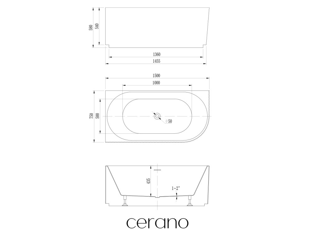 CERANO - Szabadon álló akril kád Aira, bal oldali - fehér fényes felülettel - 150x75 cm