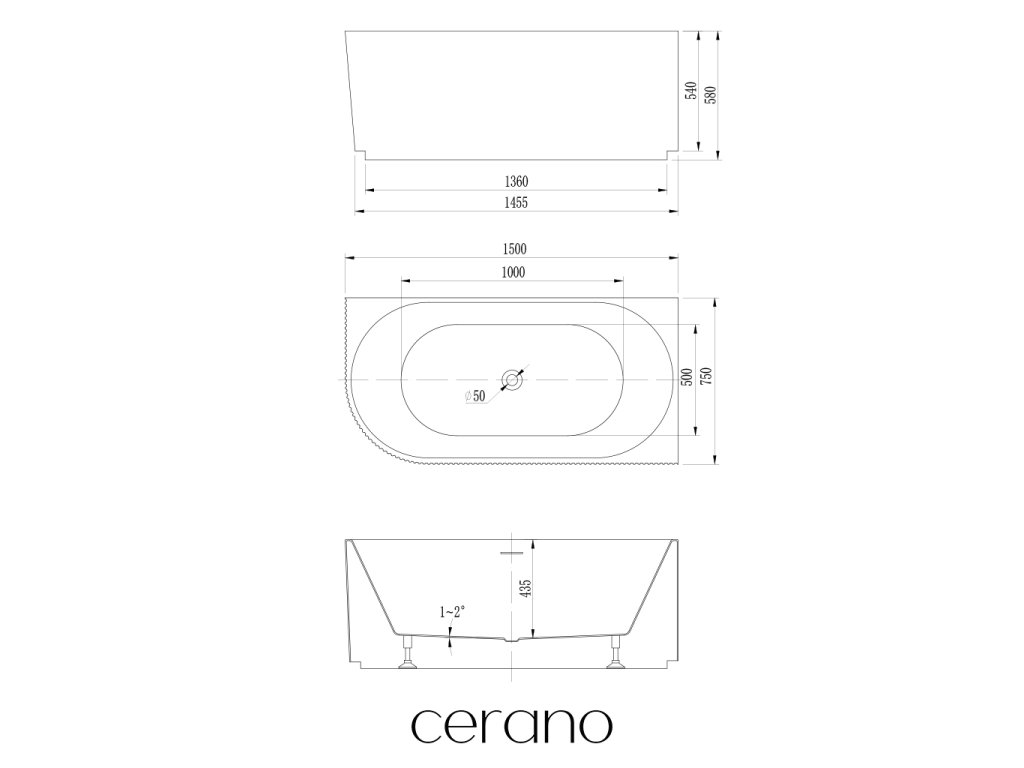 CERANO - Szabadon álló akril kád Aira, jobb oldali - fehér fényes felülettel - 150x75 cm