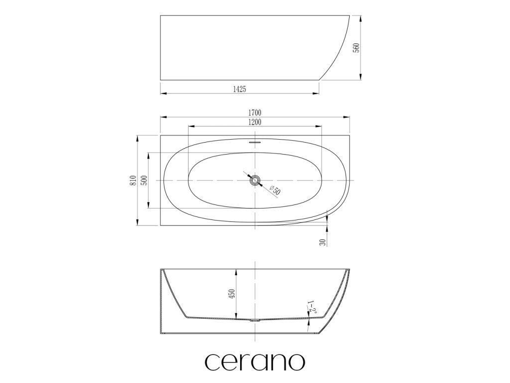 CERANO - Szabadon álló akril kád Livia, bal oldali - fehér fényes felülettel - 170x81 cm