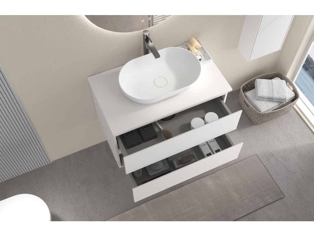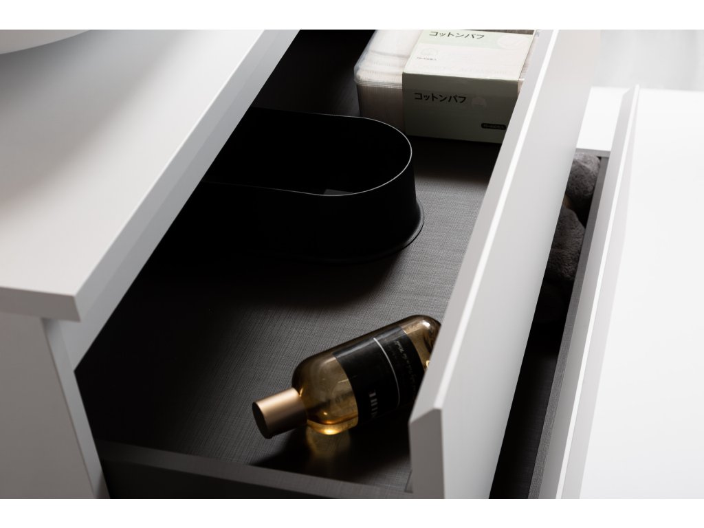 A szekrény falra szerelhető, és állítható szerelvényekkel van felszerelve, amelyek a szekrény testén a felső fríz alatt találhatók, lehetővé téve a magasság és a sík beállítását. A fiókban egy rejtett kivágás található a mosdó szifonjának beépítéséhez.