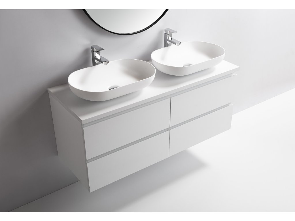 A fürdőszobaszekrények MDF laminátumból (közepes sűrűségű farostlemez) készülnek, préselt melamin fóliával bevonva, amely ellenáll a nedvességnek, a karcolásoknak, az UV-sugárzásnak és a szokásos tisztítószereknek. A felület sima, kemény, homogén és könnyen tisztítható. Az MDF lapok nem vetemednek, mint a tömör fa. Ha a laminátum mechanikai sérülést szenved, maga az MDF mag is nedvessé válhat.